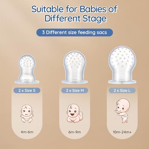 HIGH-QUALITY BABY FRUIT/FOOD FEEDERS & TEETHERS: These innovative devices allow your little one to safely try new foods.The soft silicone pouch is designed with tiny holes encouraging for self-feeding, that only ensuring small, digestible pieces are consumed. Our one-piece silicone handle design eliminates choking hazards, offering a safe, worry-free feeding experience.