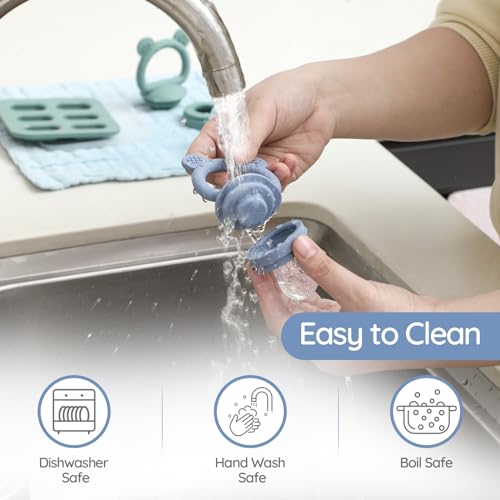 MULTI-FUNCTIONAL: Our feeder/teether combo features soft yet sturdy silicone handles that serve multiple purposes. It can be used as a feeder when your baby is ready to enjoy fruits, baby food, or breast milk. Flip it over, and the same handle transform into a teething toy, offering a safe, soothing solution for your baby’s teething needs.