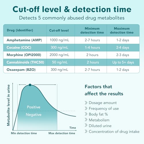 ACCURATE AND RELIABLE: Reliable drug test detecting five widely-used substances,Amphetamine (AMP)-1000 ng/mL, Oxazepam(BZO)-300 ng/mL, Cocaine (COC)-300 ng/mL, Morphine (OPI 2000)-2000 ng/mL, Cannabinoids (THC)-50 ng/mL.