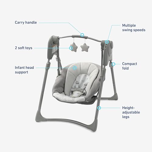 Specification: Graco Slim Spaces Compact Baby Swing, Space Saving Portable Bay Swing with Height Adjustable Legs & Soft Toys, Reign
