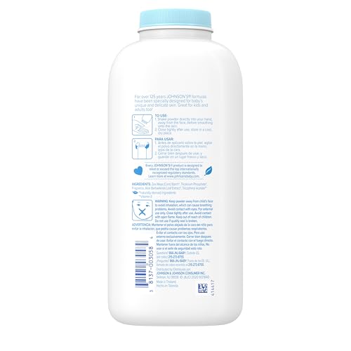 Johnson’s baby powder with naturally derived cornstarch and Aloe & Vitamin E gently absorbs moisture to soothe baby’s delicate and unique skin and leaves it feeling soft and smooth. Specially formulated for babies and infants, this soothing baby powder is dermatologist tested and clinically proven mild and gentle. This hypoallergenic baby powder is free of parabens, phthalates, dyes, and harsh fragrances. Formulated to be gentle, never harsh, this lightweight cornstarch baby powder for baby skin care has a silky texture for easy application. It’s great for kids and adults, too! To use this infant baby powder, shake powder directly into your hand away from the face before smoothing onto skin. Close the baby powder container tightly after use and store in a cool, dry place.