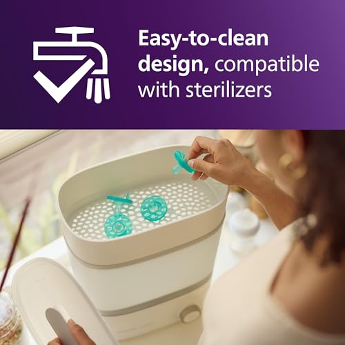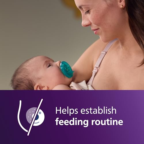 “Philips Avent Soothie one-piece newborn pacifiers are specially sized and shaped for babies 0-3 months old and adhere to the American Academy of Pediatrics guidelines¹. Soothies are made of hospital-grade, BPA-free and latex-free silicone for comfort and durability. A collapsible, symmetrical-shaped nipple designed to support healthy oral development and satisfy baby’s natural suckling needs. The unique finger-held design lets you place your finger in the nipple so parents and the village can bond and connect with the baby, making it easier to share the care. Soothie’s one-piece design ensures bacteria have nowhere to hide. This infant pacifier is made for hospital-strength sterilization − it’s extra durable and safe. Clean Philips Avent pacifier with your sterilizer or submerge it in boiling water. For hygiene reasons, replace pacifiers after 4 weeks of use. Philips Avent Soothie is distributed in hospitals nationwide. 92% of moms trust Soothie for their newborns.² The set includes 4 green pacifiers. ¹ American Academy of Pediatrics recommends to “purchase pacifiers that cannot possibly come apart. Those molded of one solid piece of plastic are particularly safe”. (Caring for Your Baby and Young Child: Birth to Age 5, 7th ed. 2019, By American Academy of Pediatrics, Tanya Remer Altmann and David L. Hill, New York: Bantam Books.) ² of moms aware of Soothie”