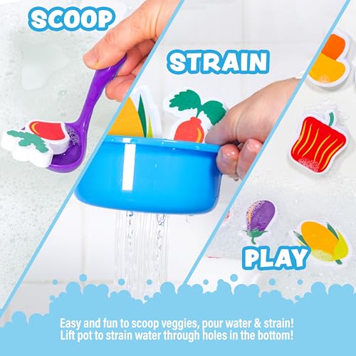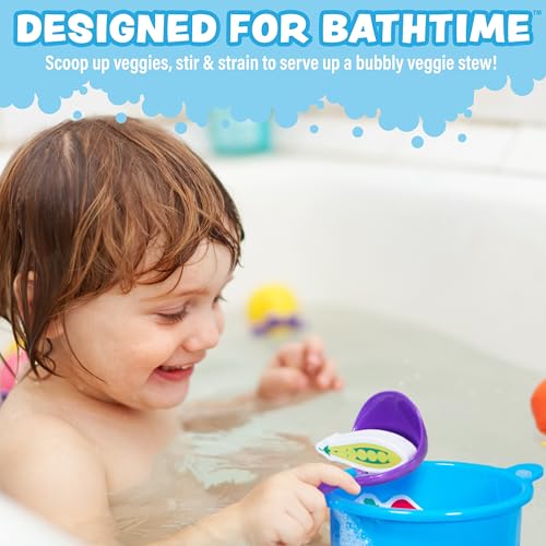 FUN IN THE TUB: Scoop, strain & serve up a bubbly veggie stew! Gather floating foam veggies, season, stir & strain for yummy Tub Soup—engaging toddler bath toys for a bubbly, imaginative kids bath!