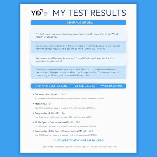 PRIVATE, FAST & EASY – The YO Home Sperm Test app guides you through the testing process with simple instructions. The test takes less than 30 minutes and requires no Male-In or Lab Visit. Keep your results and live video private or share a PDF Semen Analysis report with your Provider. Additional refill tests are also available for tracking improvements and changes over time.